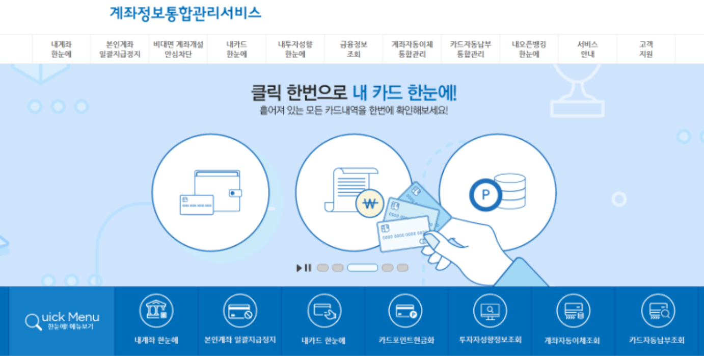 | 계좌정보통합관리서비스 | 은행계좌, 카드, 대출, 자동이체 내역 | https://www.payinfo.or.kr/ |